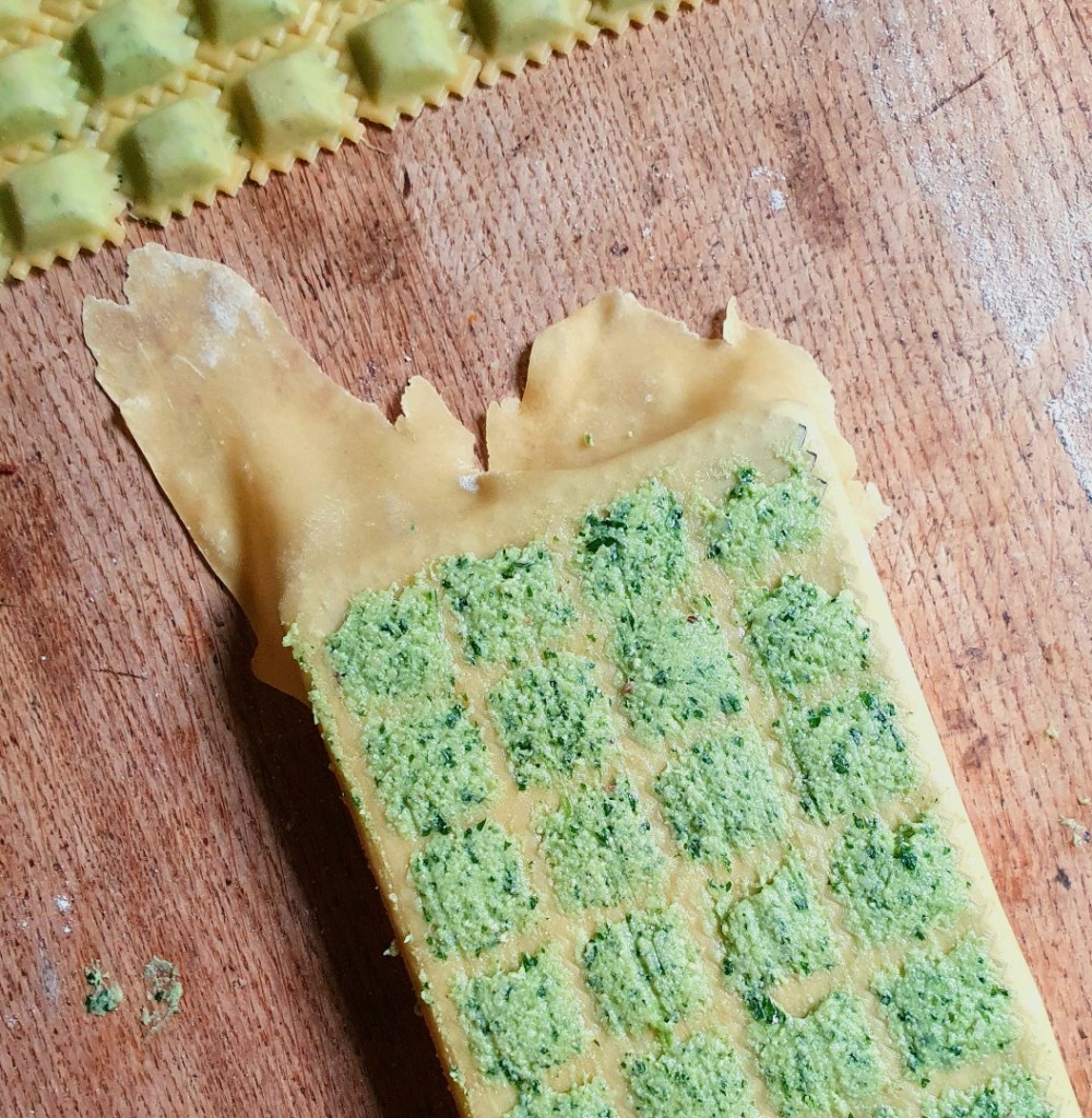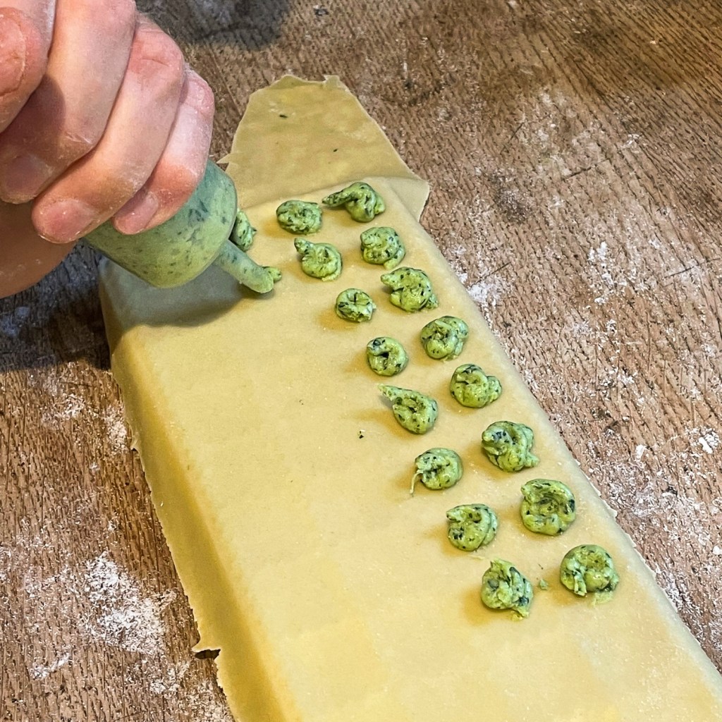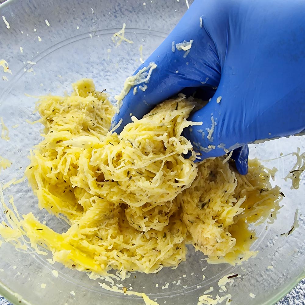(2) Die ausgepresste Kartoffelmasse mit der geklärten Butter gut mischen, würzen und zwischen 2 Backpapieren 3 mm fein auswallen,