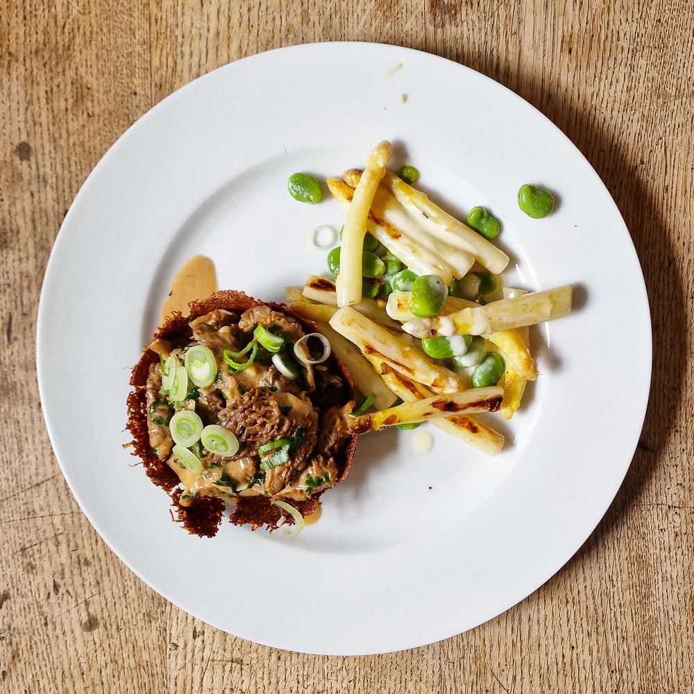 (5) Vor dem Anrichten die Morcheln in einer heissen, trockenen Pfanne anbraten. Sobald sie beginnen, Wasser abzugeben, sofort Butter, Zwiebel und Knoblauch zugeben, würzen, kurz dünsten. Mit Vin jaune ablöschen, Gemüsejus und etwas Rahm zugeben und zugedeckt bissfest garen. Abschmecken.