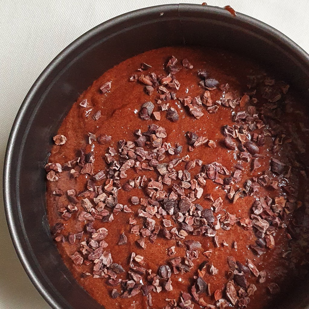 (7) Abfüllen in eine Springform. Bestreuen mit den Kako-Nibs