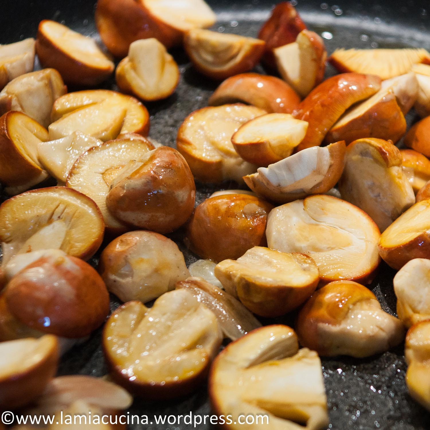 (3) Getrocknete Morcheln mit heissem Wasser überdecken und 1 h einweichen. Einweichwasser durch ein Melittafilter filtrieren und auffangen. Morcheln kalt abspülen bis sie sandfrei sind.