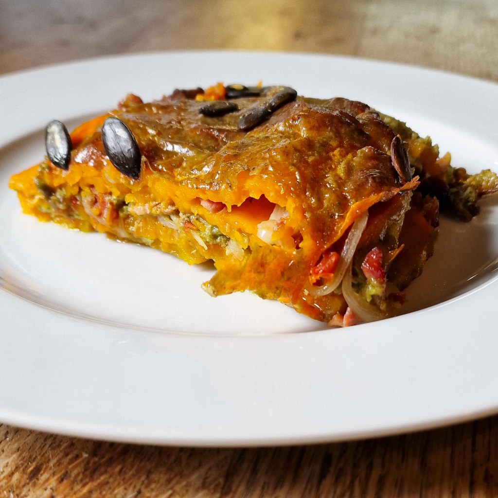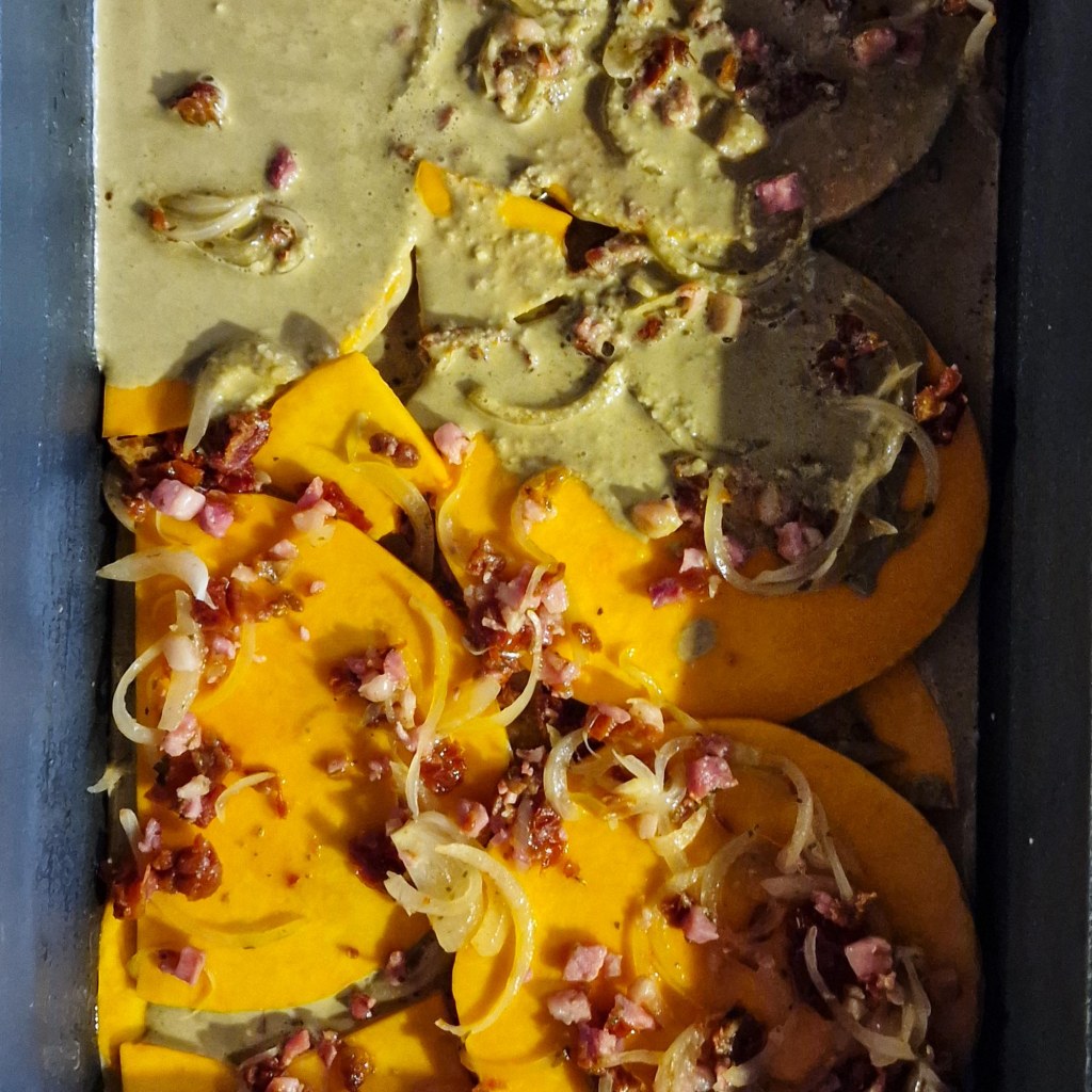 Kürbis-Gratin mit Kräutern und Speck