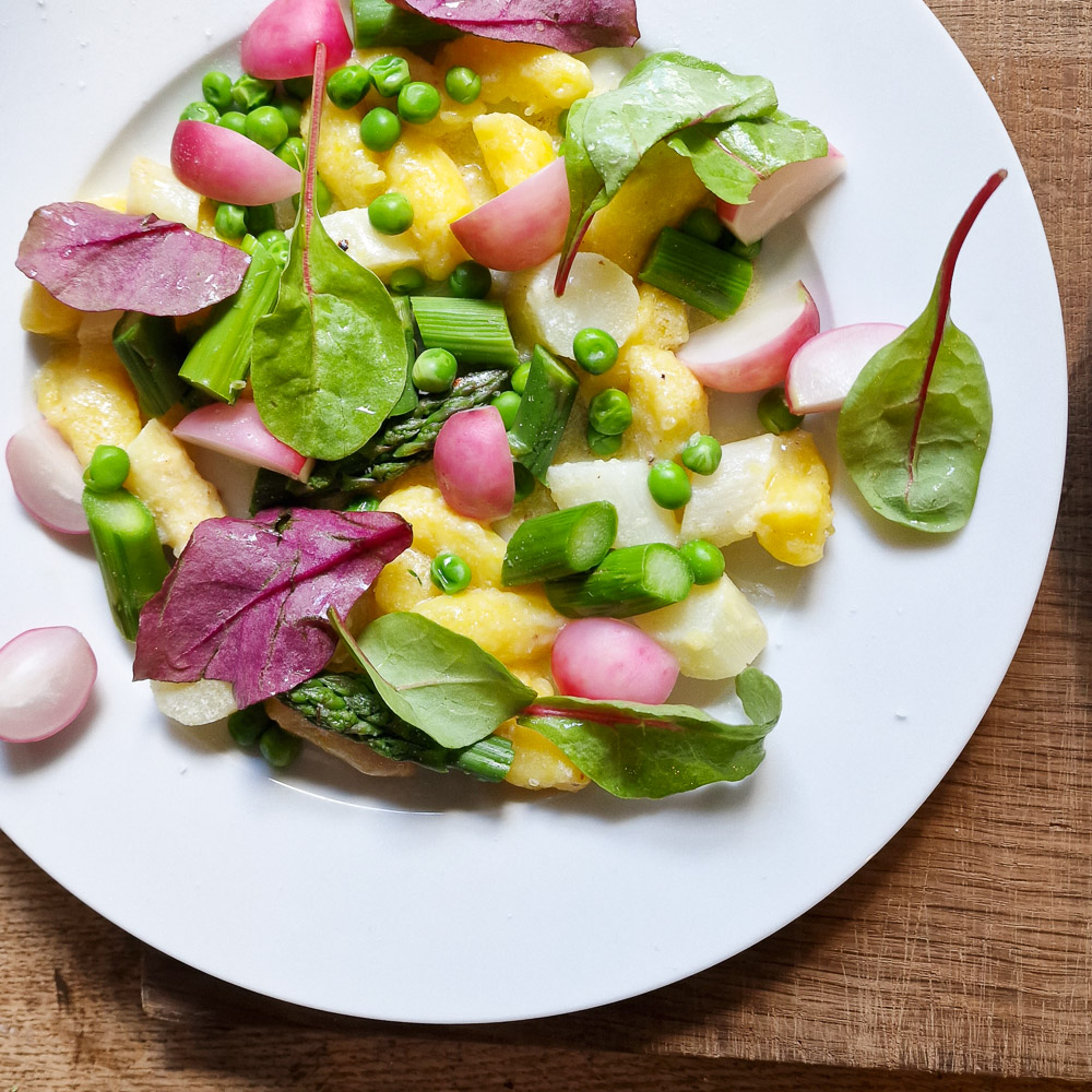 Auf den letzten Drücker ein bescheidener, frühsommerlicher Teller. Was man dazu braucht: Kartoffelgnocchi, weisser und grüner Spargel, Radieschen, Erbsen, roher Spinat. Ein Spiel mit den Farben des frühen Sommers.