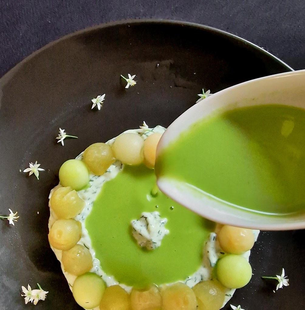 (3) weichgekochte Kürbiswürfel und Gelberbsen in einem starken Cutter (L.: Vitamix) mit etwas Wasser zu einer feinen Crème mixen. Abschmecken mit Salz, Gewürzpulver und Zitronensaft, Olivenöl zugeben und kurz glatt mixen. Warm stellen