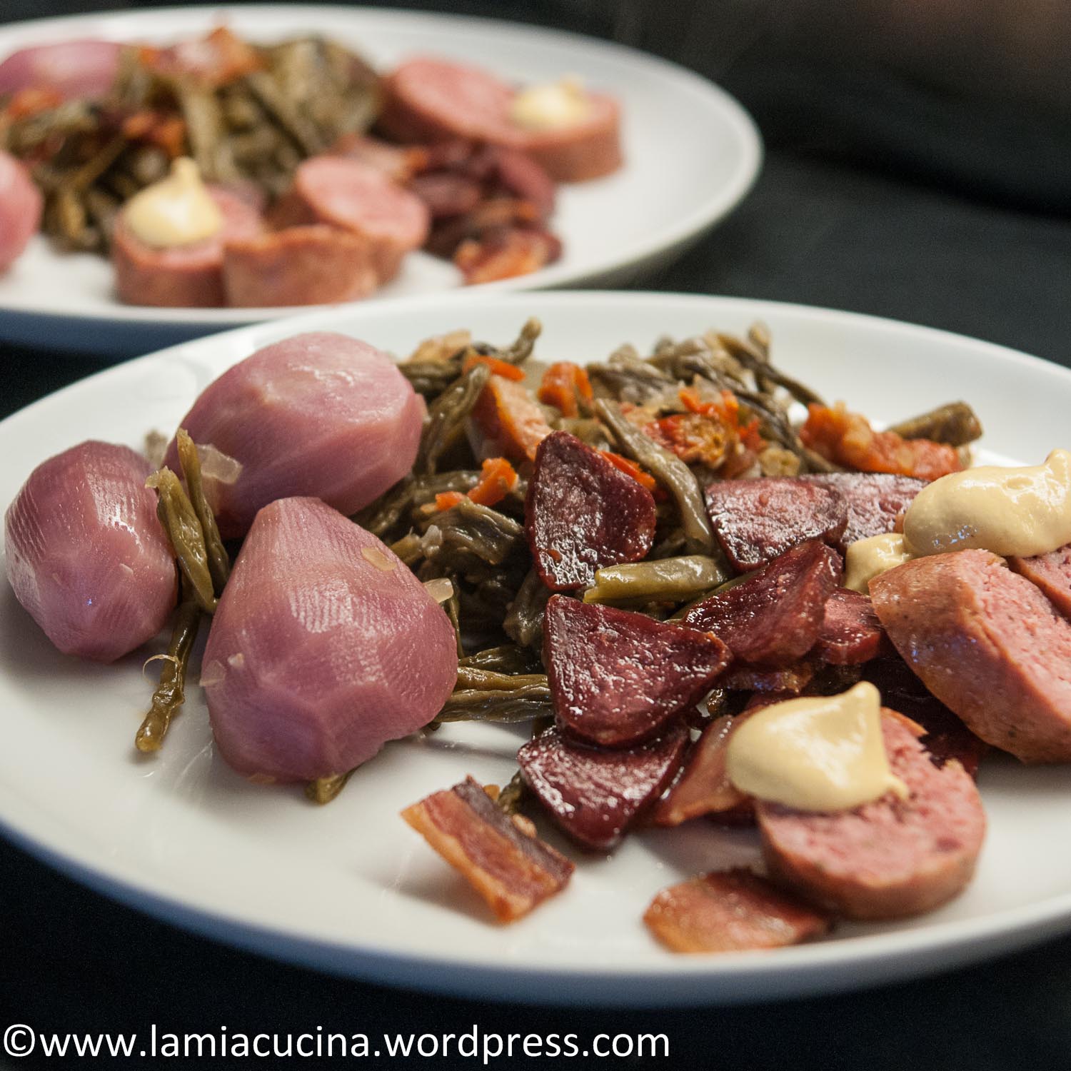 Anschliessend die Wurstparade mit den beiden Blutwürsten und der Leberwurst zu Dörrbohnen und Zwiebelringen.